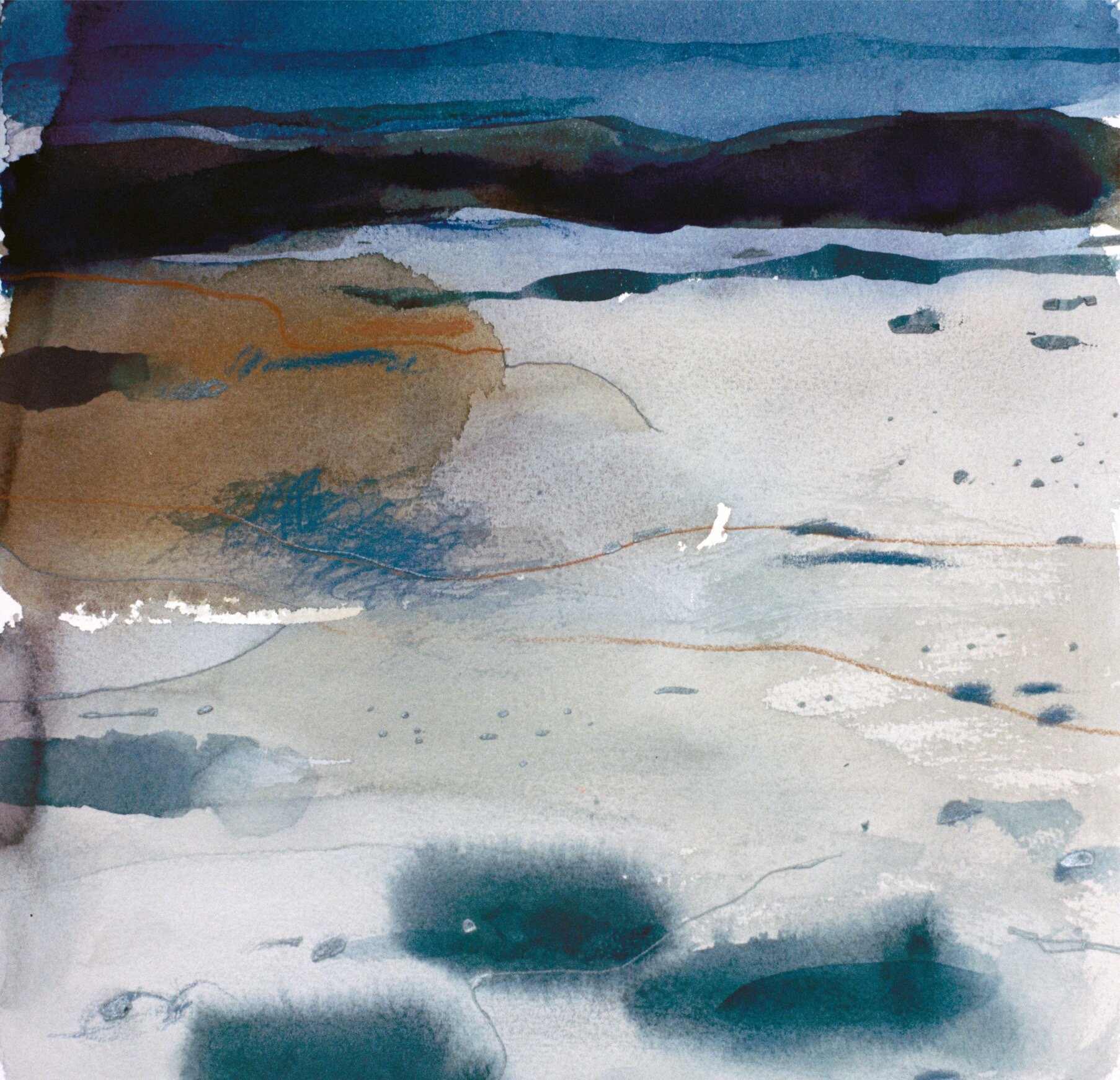 “A series of paintings in gouache and crayon inspired by the west coast of Scotland and, in particular, the coast around Applecross (Coillie Ghillie). Painted after a visit, I referred to basic pencil-line sketches and attempted to use the memory of place rather than too direct a reference to the topography of the area, letting the medium suggest the water and the never-ending sky.”